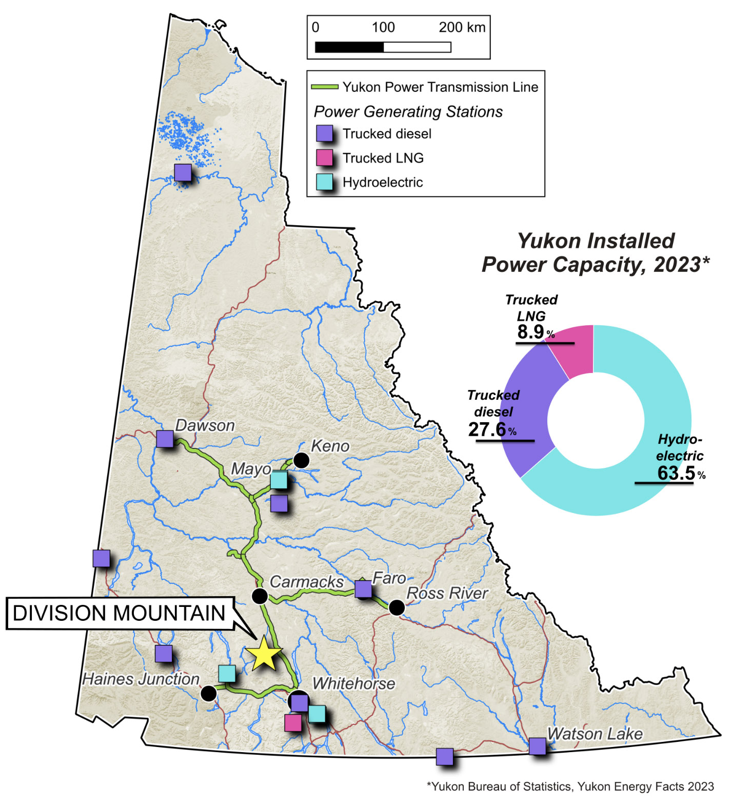 Recent reporting by the Yukon Energy crown corporation has forecasted a 50% peak demand increase for non-industrial electricity uses by 20352. This surge is further amplified by major mine projects that are advancing in the territory. As there are no crude oil pipelines, crude-by-rail facilities, or natural gas pipelines in the Yukon, virtually all of the fuel for thermal power generation is delivered to communities by truck from Alberta and British Columbia. The Division Mountain deposit is located 20 km west of a major electrical transmission line and ideally situated to provide feedstock to a local power plant.