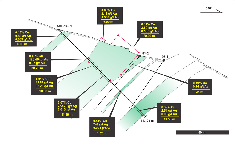 - Stacked mineralized intervals include 0.40% copper and 128.46 g/t silver over 30.23 m
