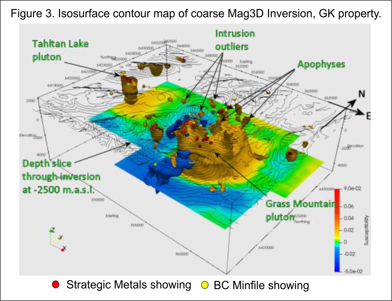 An interpretation of property-wide, helicopter-borne magnetic and radiometric data set has just been completed by SJV Consultants Ltd., on behalf of Strategic. 3D interpretation of the magnetic data shows that the Grass Mountain pluton forms a circular magnetic high, which models as a large, steep-sided body that gradually widens with depth. Across the northern portion of the pluton, circular to elliptical pipes extend upwards and form apophyses from the buried intrusion. Several of the showings identified by historical work are now revealed to be associated with the surface expression of these apophyses (Figure 3). Only limited prospecting and rock sampling in the vicinity of these apophyses has been performed; however, rock samples collected from these areas have returned up to 1.31 g/t gold and 1.5% copper, and on the periphery of one of these apophyses, a surface chip sample assayed 20.2 g/t gold and 0.68% copper over 0.7 m. An induced polarization (IP) survey conducted across a glacial-till covered area within one of the copper-gold geochemical anomalies has defined a steeply dipping resistivity low and associated chargeability high, down-dip of the magnetic high (Figure 2). This highly prospective target has not been drill tested. Interpretation of the property-wide radiometric data has also identified several areas of interest outside of the main showings. The most interesting target is a large area at the southwest edge of the Grass Mountain pluton, where low Th/K values overlie a recently identified magnetic high. These characteristics suggest the presence of extensive potassic alteration associated with a buried intrusion or another apophysis off the Grass Lake pluton.